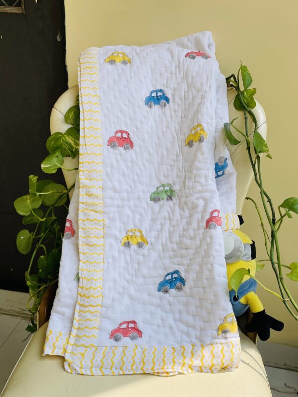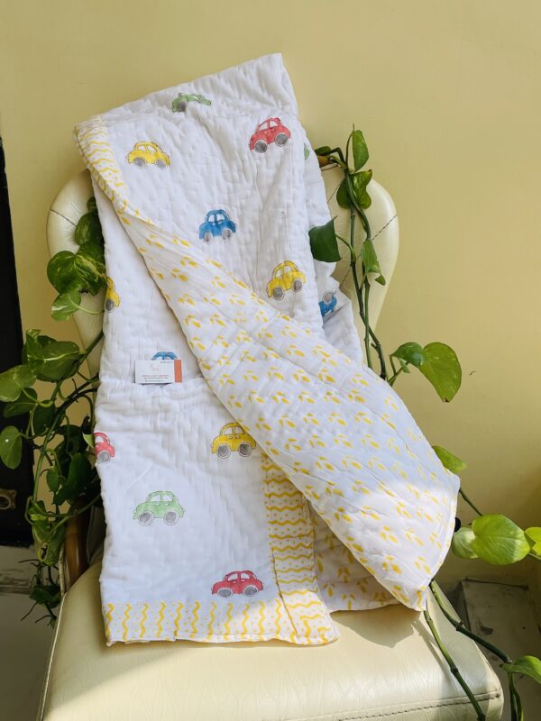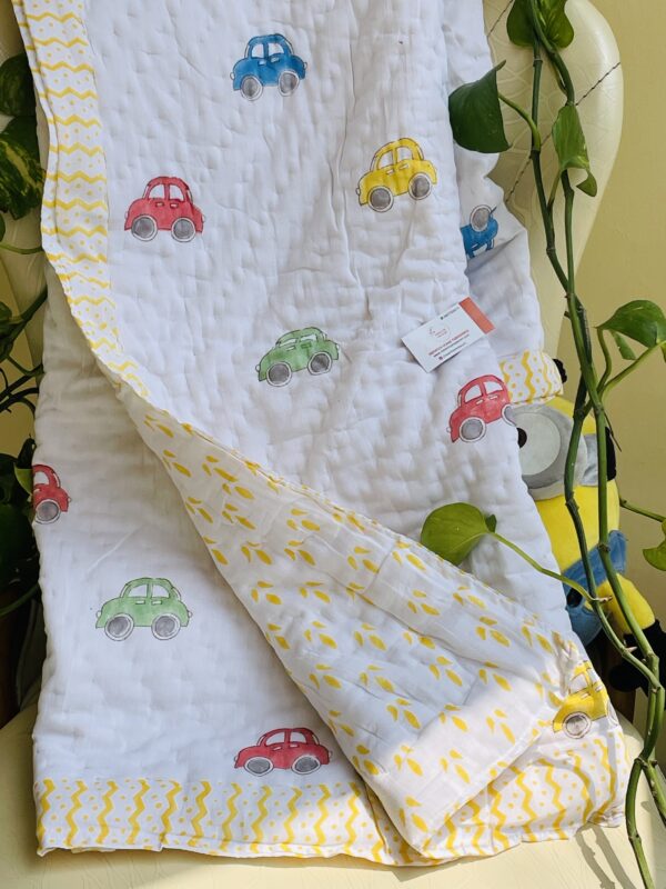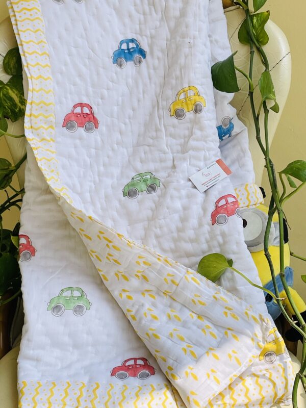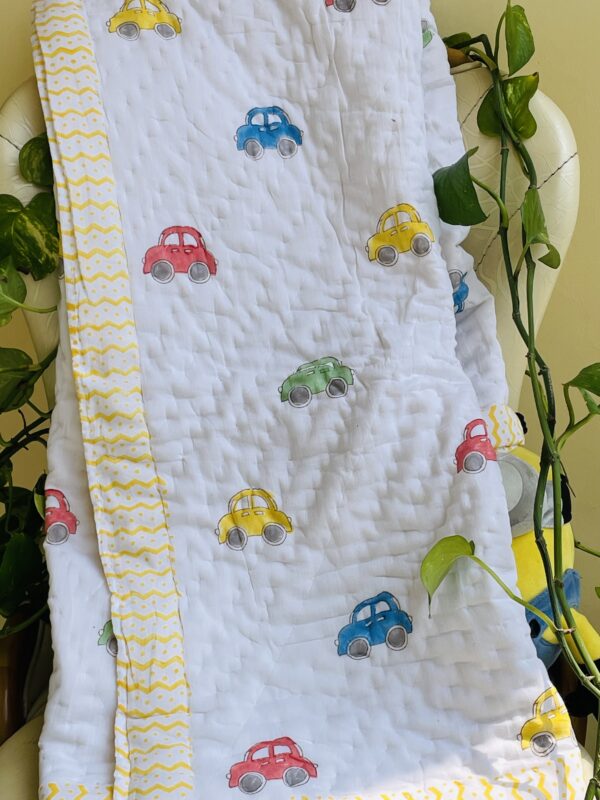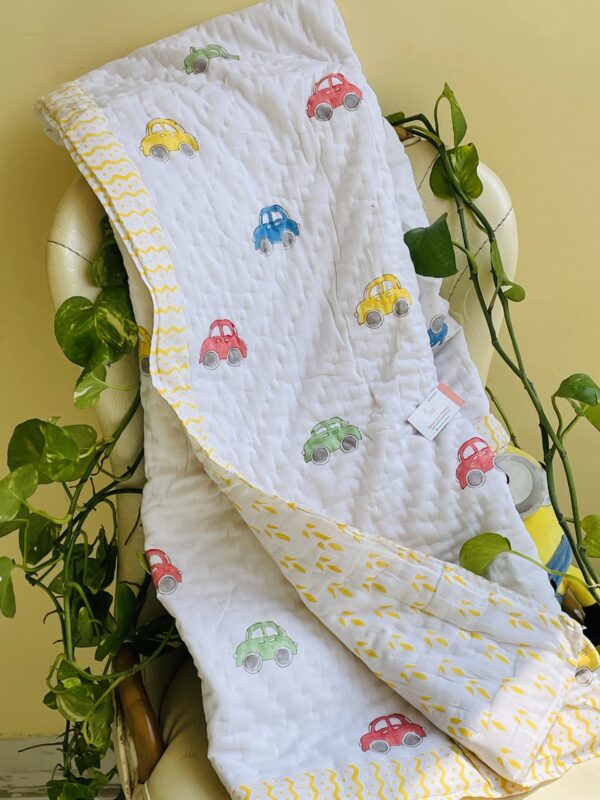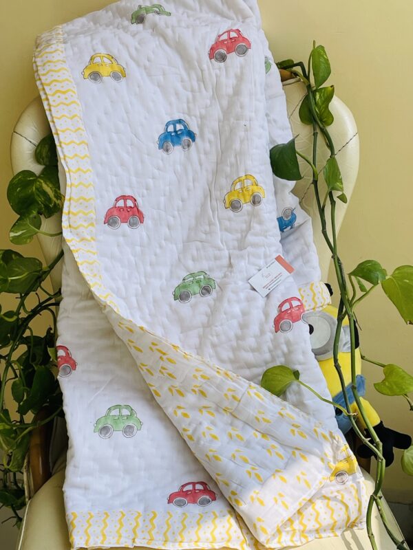 CAR HANDBLOCK PRINTED REVERSIBLE MULMUL BABY QUILT | COMFORTER