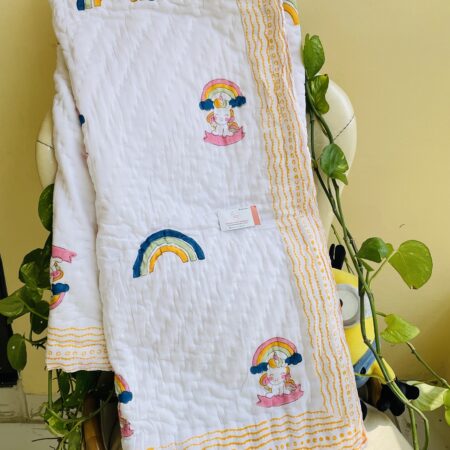 Our Snowy baby quilt is made with the softest organic cotton mulmul fabric, soft against your little one’s skin, filled with a layer of organic cotton and two layers of breathable mulmul keeps the baby appropriately warm.