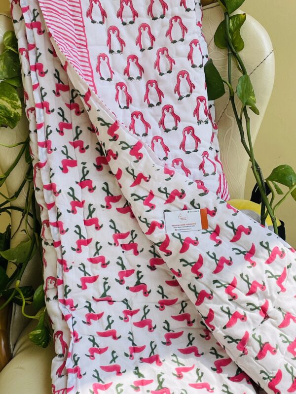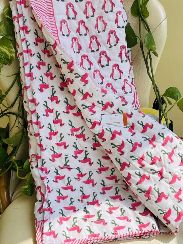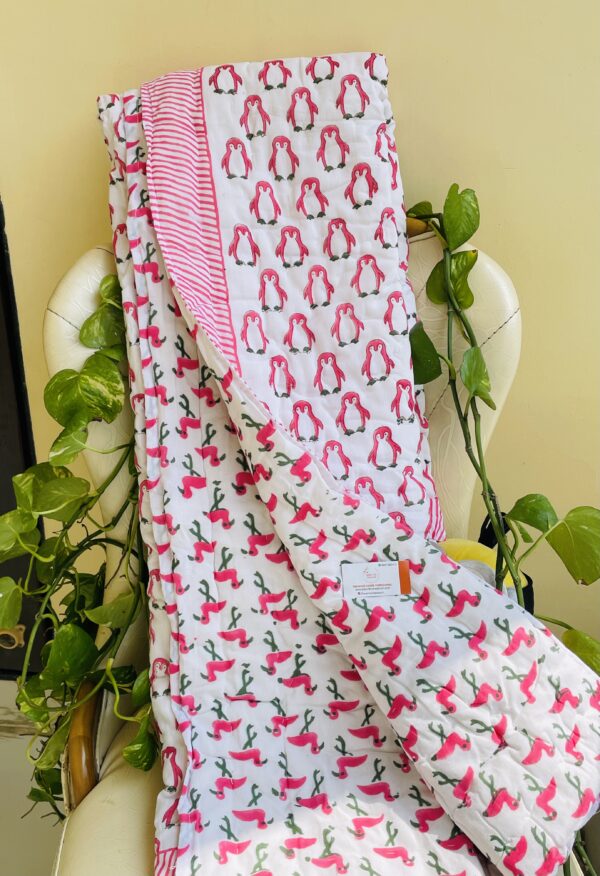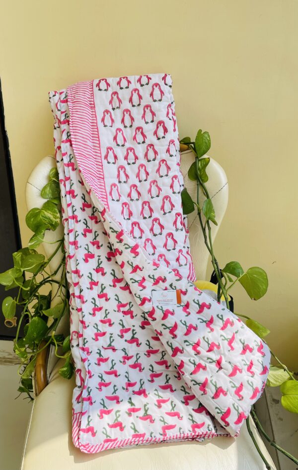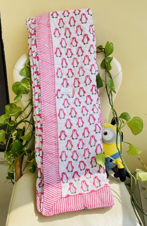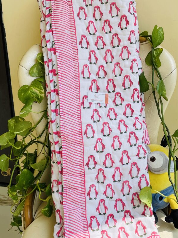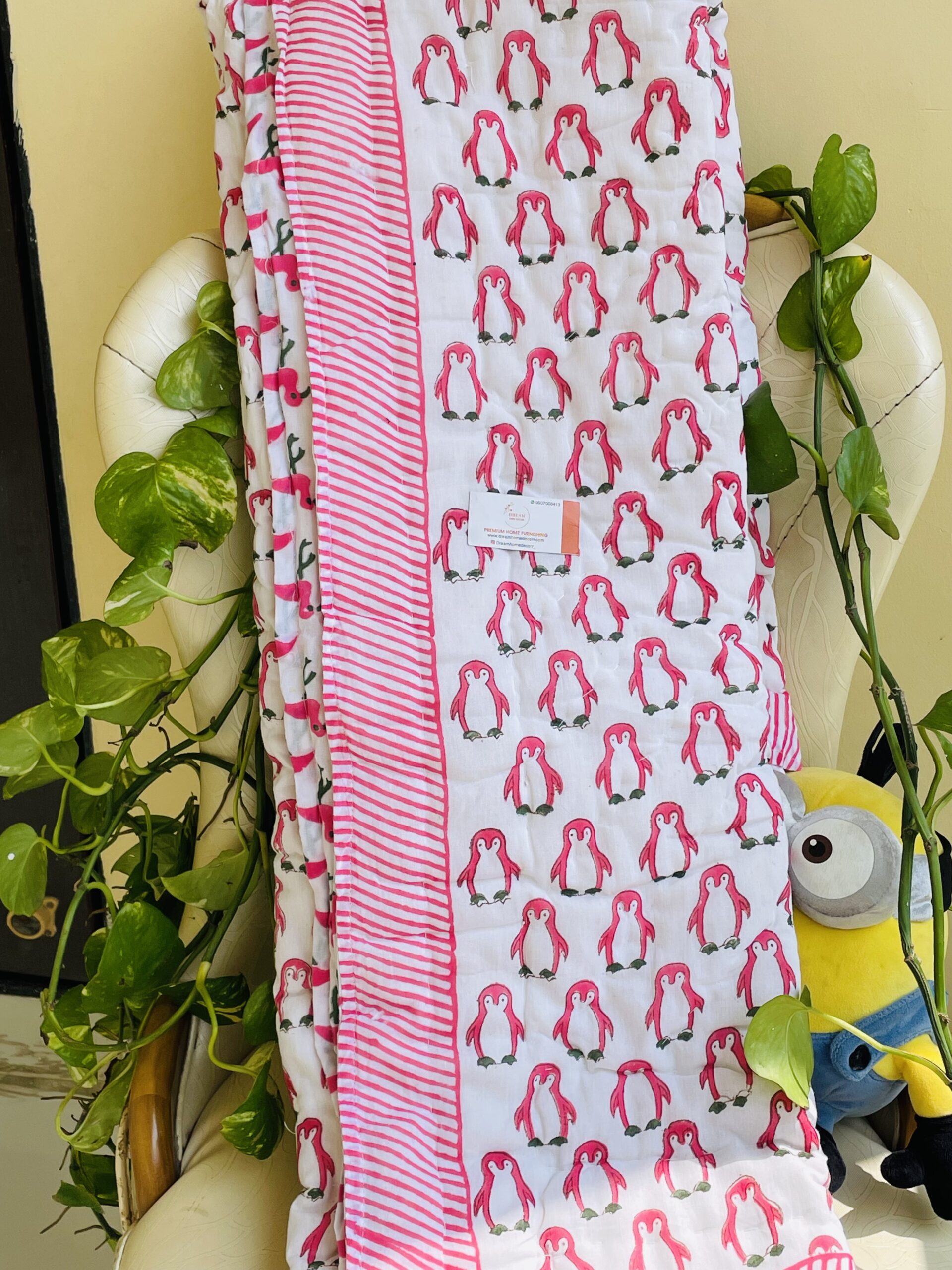 PINK PENGUIN HANDBLOCK PRINTED REVERSIBLE MULMUL BABY QUILT | COMFORTER
