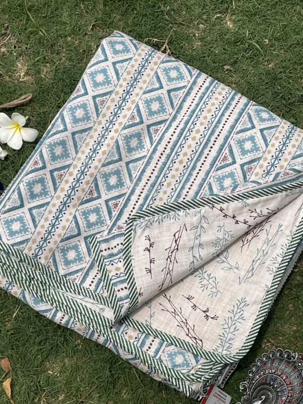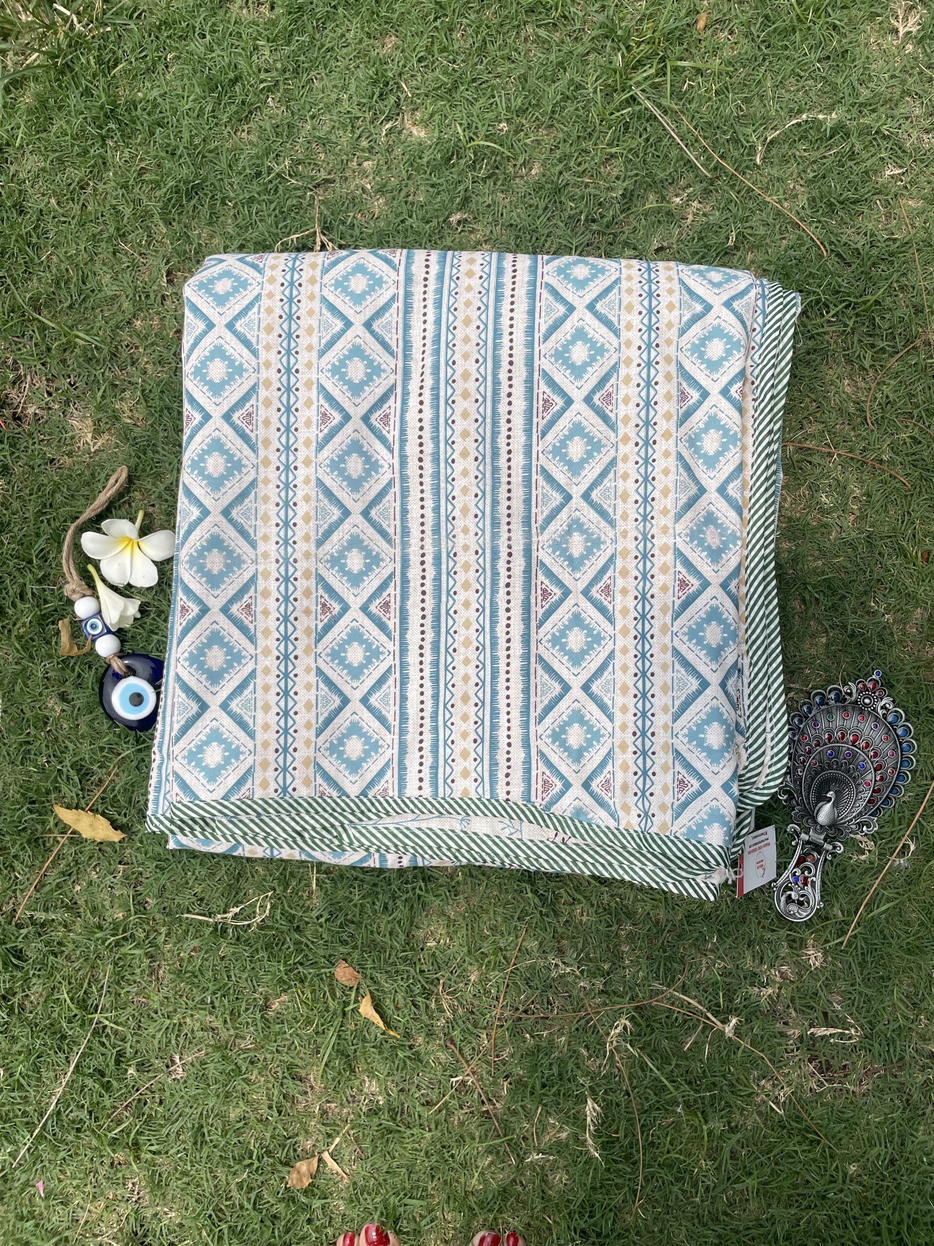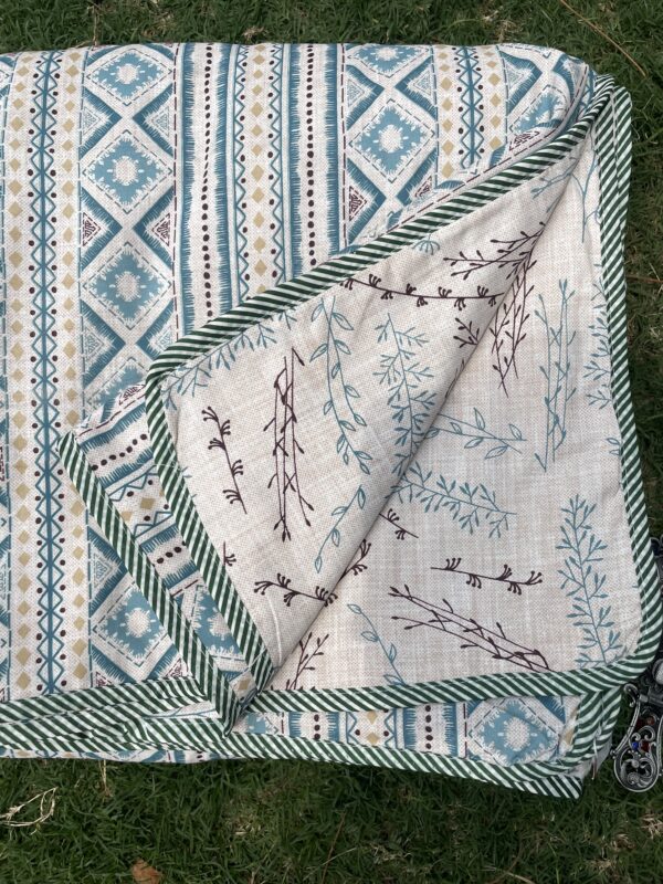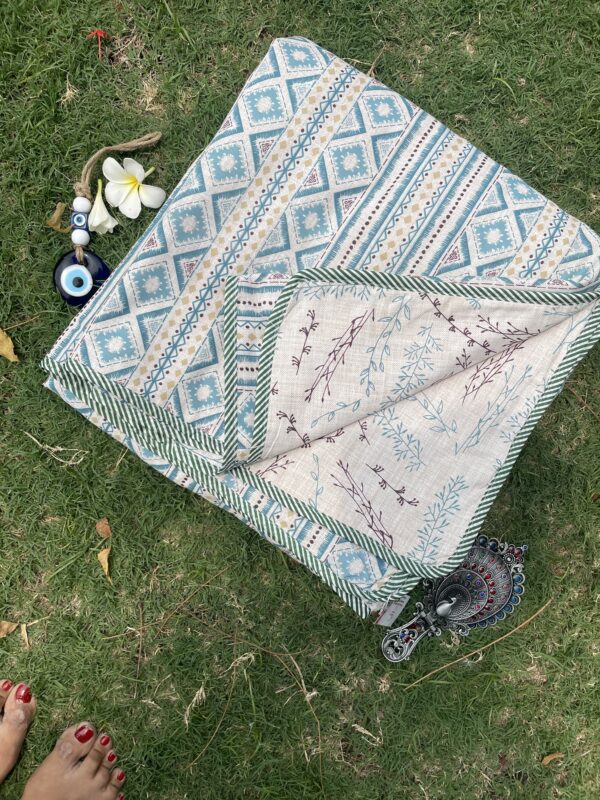 This  dohar has two layers of soft  cotton, a middle layer of flannel sheet & finished with complementing piping on all the four sides for a tidy & attractive look.